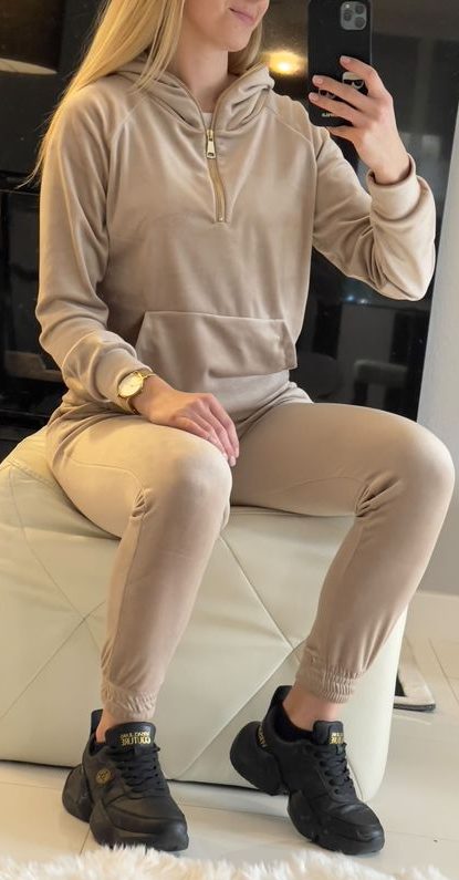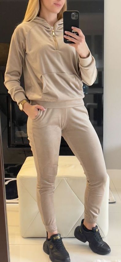 DRES WELUROWY BEŻ VELSATINO polskiej marki. Bluza z kapturem, posiada wyszywane logo z przodu. Spodnie w pasie są na gumce. Materiał jest grubszy, nieprześwitujący.