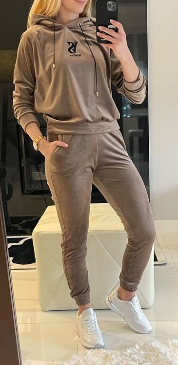 DRES WELUROWY BEZ VELSATINO polskiej marki. Bluza z kapturem, posiada wyszywane logo z przodu. Spodnie w pasie są na gumce. Materiał jest grubszy, nieprześwitujący.
