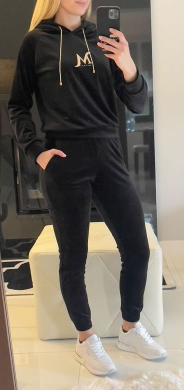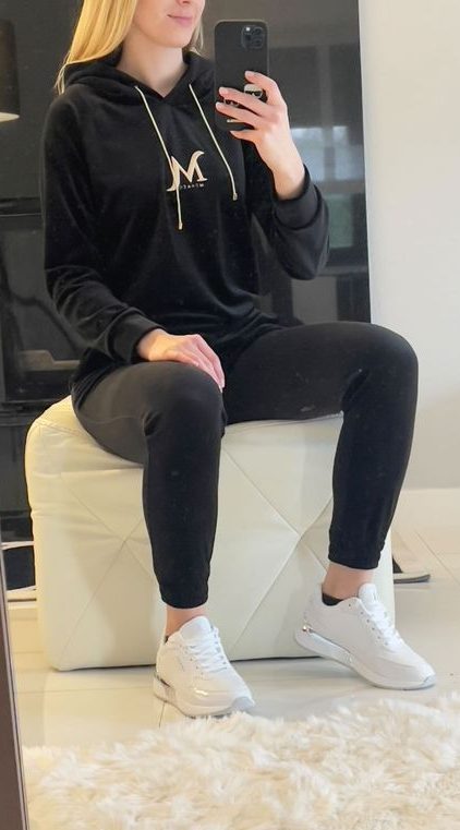 DRES WELUROWY CZARNY MONACO polskiej marki. Bluza z kapturem, posiada wyszywane logo z przodu. Spodnie w pasie są na gumce. Materiał jest grubszy, nieprześwitujący.