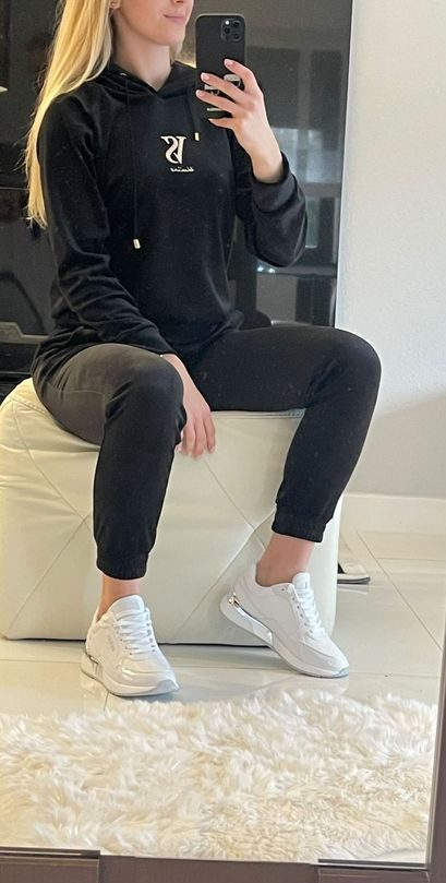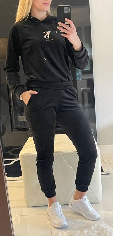 DRES WELUROWY CZARNY VELSATINO polskiej marki. Bluza z kapturem, posiada wyszywane logo z przodu. Spodnie w pasie są na gumce. Materiał jest grubszy, nieprześwitujący.